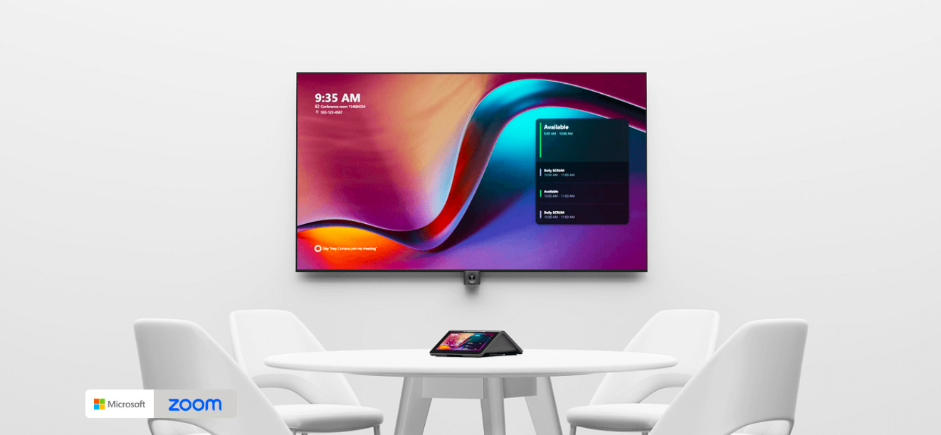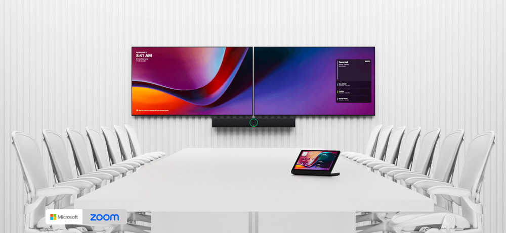 - Signage / welcome screen: when the room is not in use, the display can switch to digital signage to show availability, institutional visuals or other messages.