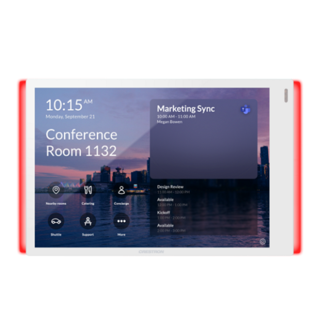 Les panneaux de réservation de salle Crestron Flex Scheduling sont des écrans tactiles muraux conçus pour optimiser la gestion des espaces de travail. Ils permettent de réserver, libérer ou prolonger une réunion en temps réel, affichant clairement la disponibilité de la salle grâce à un code couleur intuitif.